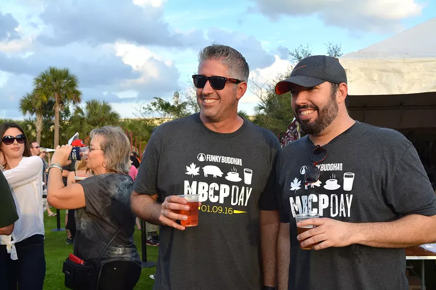 Funky Buddha founders KC (left) and Ryan Sentz rejoice the brewery’s Maple Bacon Coffee Porter Day in 2016.